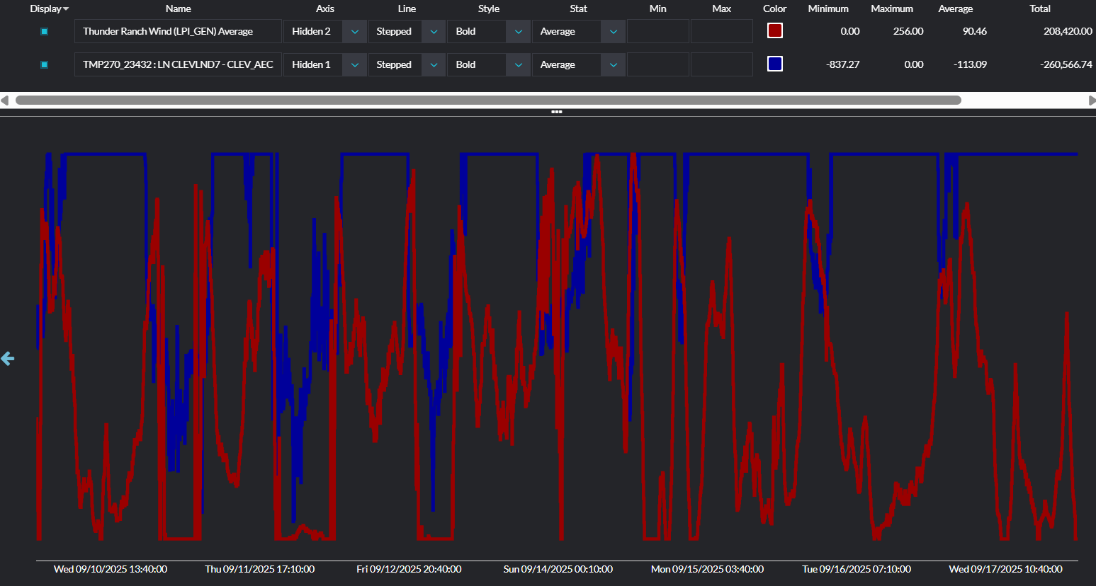 Example: Live Power generation data can be combined with transmission constraint information to visualize when wind farms (Thunder Ranch in Oklahoma) drive congestion on the system.